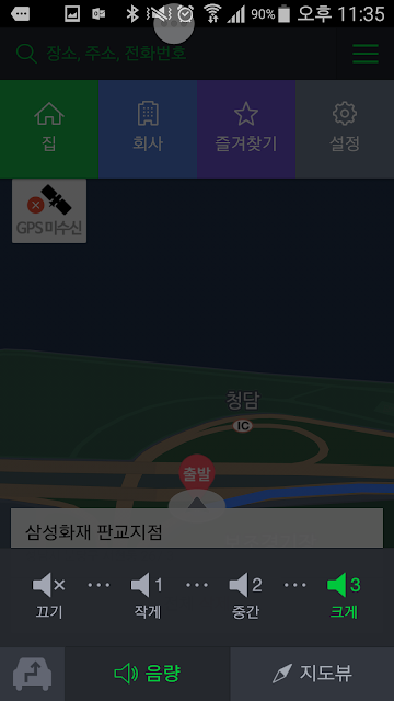 왼쪽 아래 녹색 차 마크를 누르면 음량과 지도뷰를 변경할 수 있는 메뉴가 나옵니다. 음량은 3가지가 나오는데 창문을 열고 1,2 단계는 잘 들을수가 없습니다. 3단계는 되어야 외부 소음이 있어도 잘 들립니다. 현재 여자 안내 음성만 나옵니다.